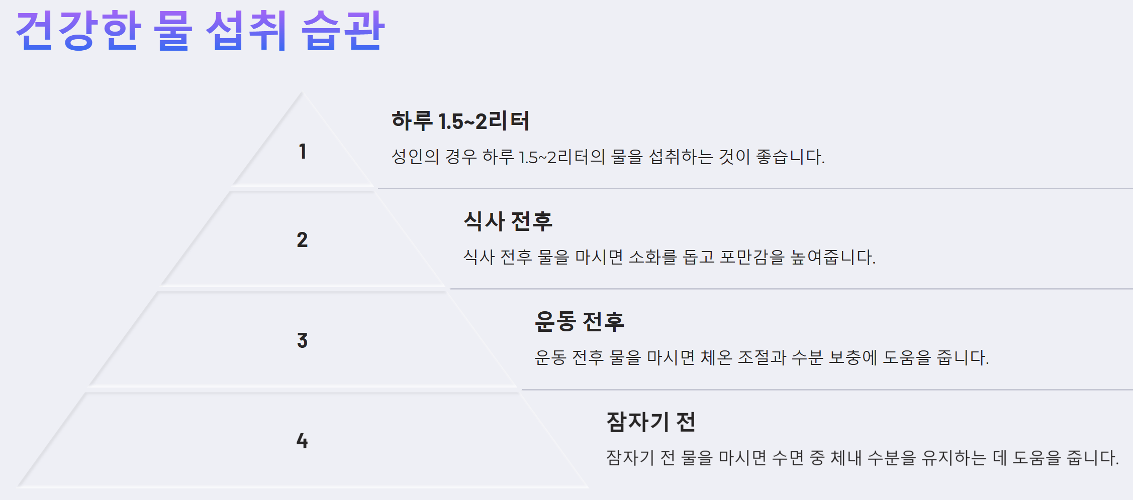 - 물 마시는 시기: 목이 마를 때뿐만 아니라, 식사 30분 전후, 운동 전후, 잠자기 전 등에도 물을 마셔주는 것이 좋습니다.