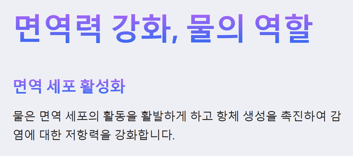 - 세포 활성화: 물은 세포 내외의 물질 교환을 원활하게 하여 세포의 기능을 유지하고 활성화합니다. 건강한 세포는 바이러스나 세균에 대한 저항력이 높아 감염 질환에 잘 걸리지 않습니다.