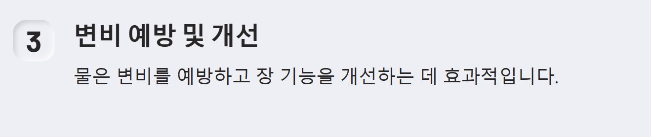 - 장 건강 증진: 충분한 수분 섭취는 장내 유익균의 활동을 촉진하고, 유해균의 증식을 억제하여 장 건강을 유지합니다.