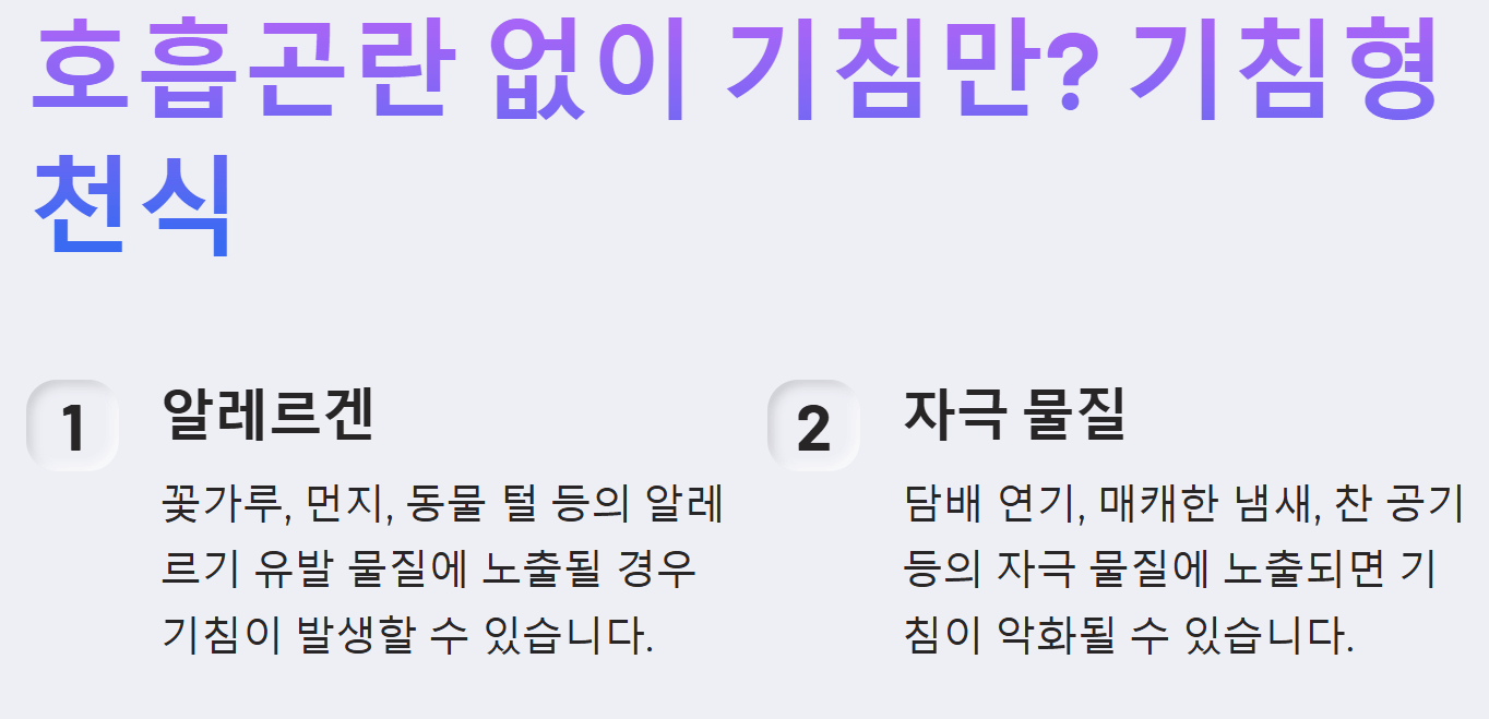 - 원인: 알레르겐, 자극적인 물질, 운동 등