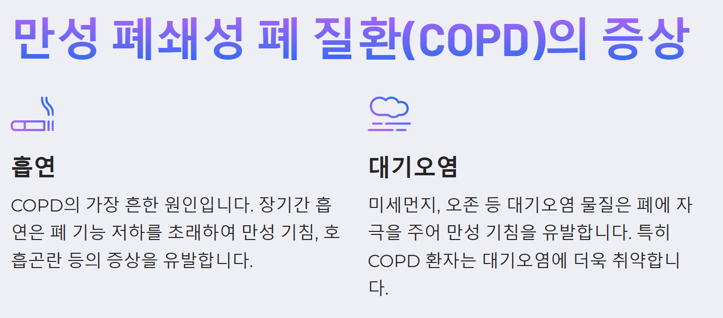 - 원인: 흡연, 대기오염, 직업성 먼지 노출 등