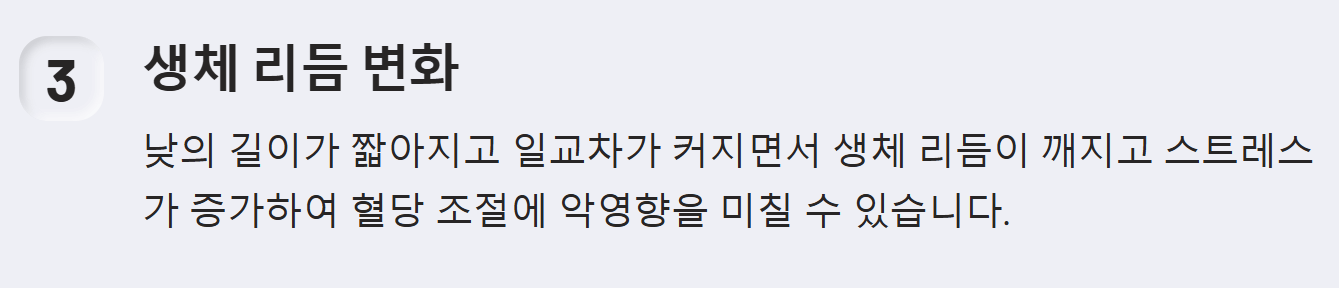 - 생체리듬 변화: 낮이 짧아지고 일교차가 커지면서 수면 패턴이 불규칙해지고 스트레스를 받기 쉬워 혈당 조절이 어려워질 수 있습니다.