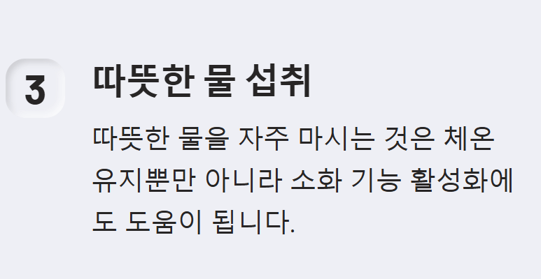 - 따뜻한 물 섭취: 따뜻한 물을 자주 마셔 체온을 유지하고 소화를 돕습니다.