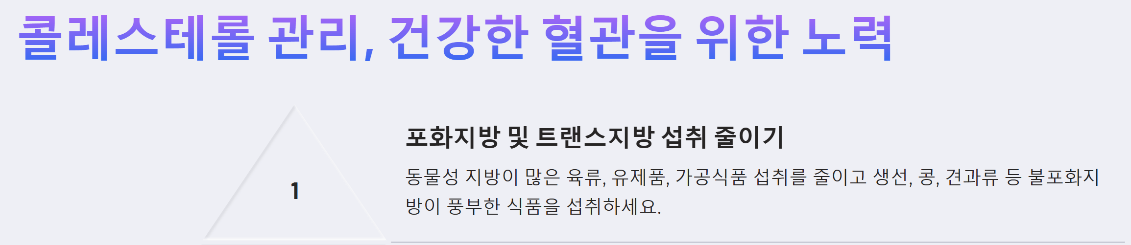 - 식이요법: 포화지방산 및 트랜스지방산 섭취를 줄이고, 불포화지방산 섭취를 늘립니다.