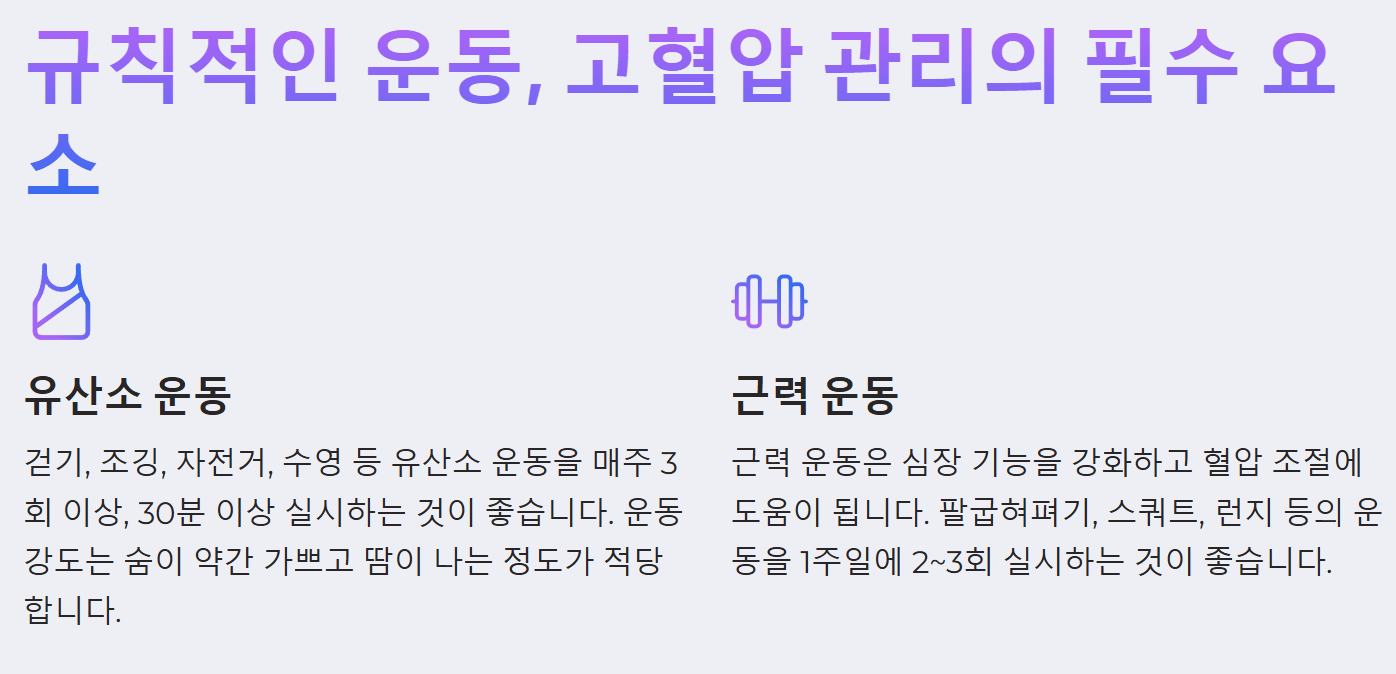 매일 30분 이상의 유산소 운동은 혈압을 낮추고 심혈관 건강을 증진합니다. 걷기, 조깅, 자전거 타기, 수영 등 자신에게 맞는 운동을 꾸준히 하는 것이 중요합니다. 규칙적인 운동 실천 전략은 다음과 같습니다.