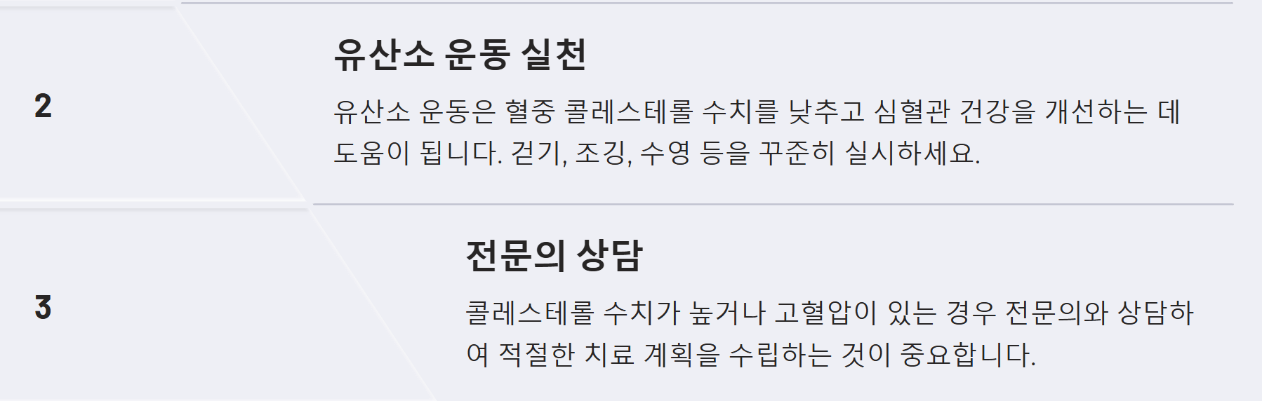 - 규칙적인 운동: 유산소 운동은 혈중 콜레스테롤 수치를 낮추는 데 도움이 됩니다.