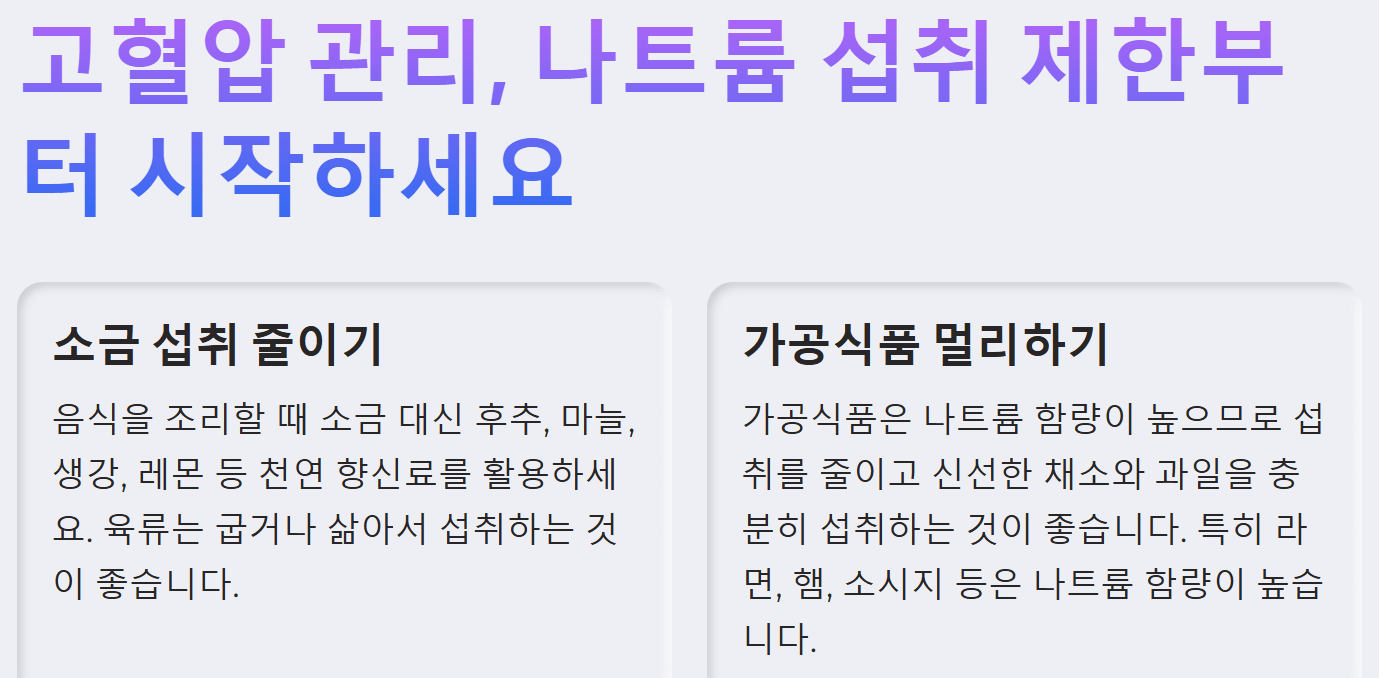 - 가공식품 섭취 줄이기: 가공식품에는 나트륨이 많이 첨가되어 있으므로 신선한 식재료를 사용하여 직접 요리하는 것이 좋습니다.