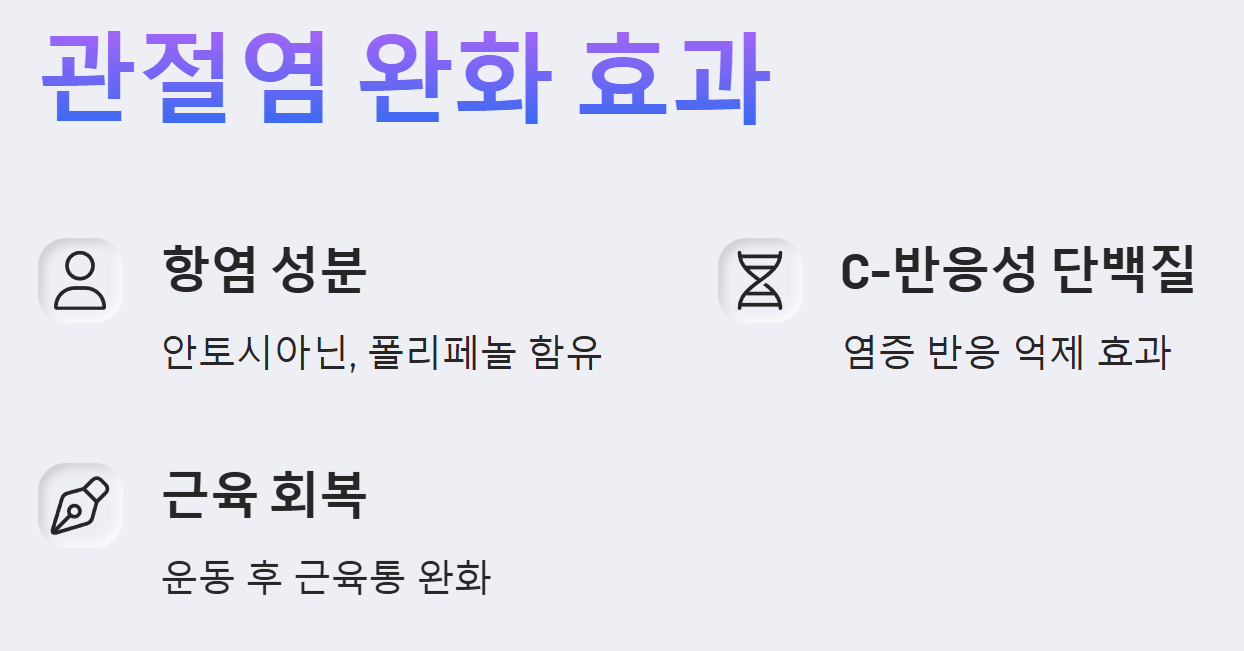 - 강력한 항염 효과로 관절 염증 감소: 타트체리에는 안토시아닌, 폴리페놀, 플라보노이드, 퀘세틴 등 다양한 항산화 물질이 풍부하게 함유되어 있습니다. 이러한 성분들은 체내 활성산소를 제거하고 염증 유발 물질의 생성을 억제하여 관절 부위의 염증을 효과적으로 줄여줍니다. 실제로 류머티즘 저널에 실린 연구에 따르면, 매일 타트체리 주스를 섭취한 실험 참가자들의 무릎 통증 점수가 그렇지 않은 그룹에 비해 현저히 낮아진 것을 확인할 수 있었습니다.