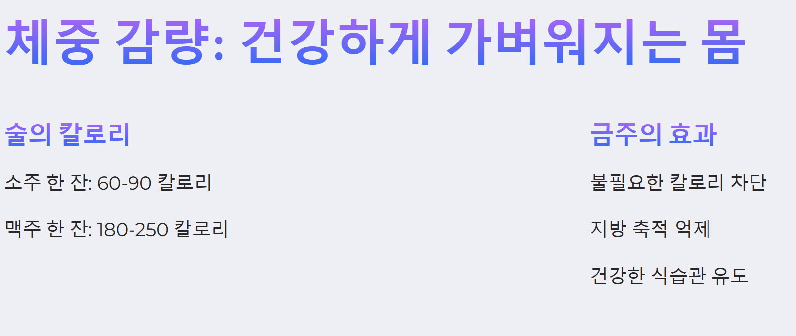 - 불필요한 칼로리 차단: 술은 액체 형태로 존재하여 우리가 인지하지 못하는 사이에 많은 칼로리를 섭취하게 만듭니다. 이러한 '빈 칼로리'는 영양가는 낮으면서도 체중 증가의 주요 원인이 됩니다. 금주를 통해 술로 섭취하는 불필요한 칼로리를 줄이면, 전체적인 에너지 섭취량을 효과적으로 관리하고 체중 증가를 예방할 수 있습니다. 이는 장기적인 건강 관리에도 매우 중요한 부분입니다.