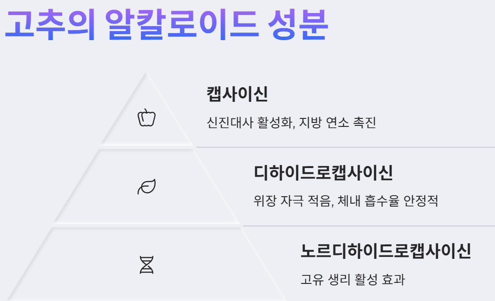 - 캡사이신: 고추의 주된 매운맛 성분으로, 신진대사를 활발하게 하고 지방 연소를 촉진하는 효과가 있으며, 진통 작용도 일부 있는 것으로 알려져 있습니다. 또한, 혈액 순환을 개선하고 심혈관 건강에도 긍정적인 영향을 미칠 수 있다는 연구 결과가 있습니다.