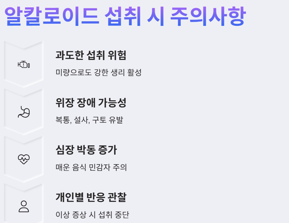 알칼로이드는 미량으로도 강력한 생리 활성 효과를 나타낼 수 있지만, 과도하게 섭취할 경우에는 예상치 못한 부작용이 발생할 수 있으므로 주의 깊은 섭취가 필요합니다.
