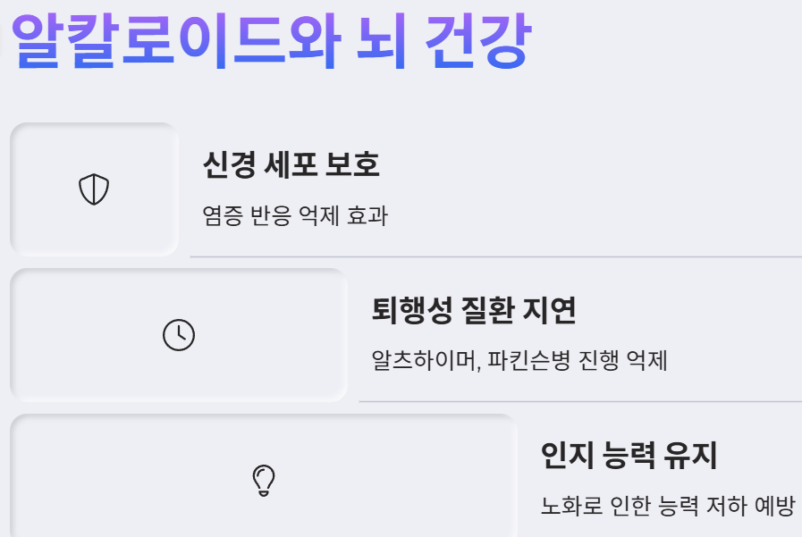 - 강력한 항산화 작용: 일부 알칼로이드 성분들은 체내 유해 활성 산소를 제거하는 뛰어난 항산화 능력을 보유하고 있습니다. 활성 산소는 세포 손상을 유발하고 노화 과정을 촉진하며, 각종 만성 질환의 원인이 되기도 합니다. 따라서 알칼로이드의 항산화 작용은 세포 보호 및 질병 예방에 중요한 역할을 수행할 수 있습니다.