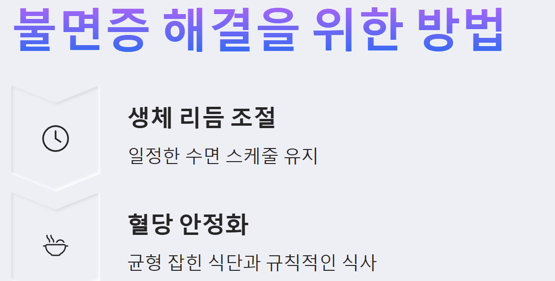 그렇다면 불면증을 해결하려면 어떻게 해야할까요? 건강한 수면은 혈당 관리에 필수적입니다. 규칙적인 생활 습관을 유지하고 편안한 수면 환경을 조성하여 숙면을 취하도록 노력해야 합니다. 불면증을 해결하는 방법은 아래 글에서 확인할 수 있습니다.