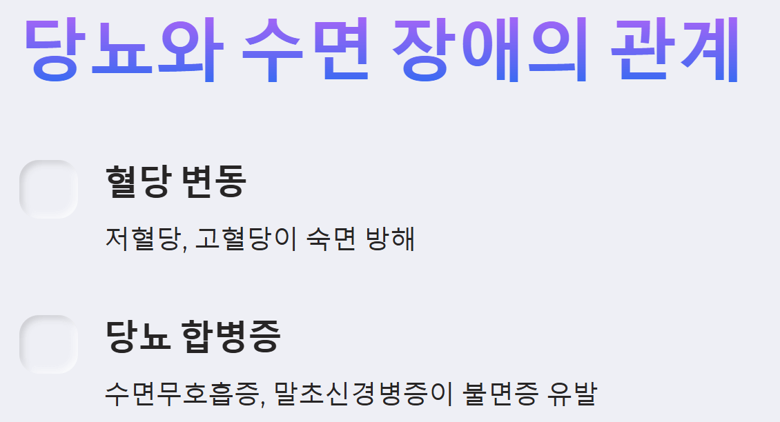 - 혈당 변동: 저혈당은 어지럼증, 발한 등을 유발하여 숙면을 방해하고, 고혈당은 잦은 야간뇨로 깊은 잠을 어렵게 합니다.