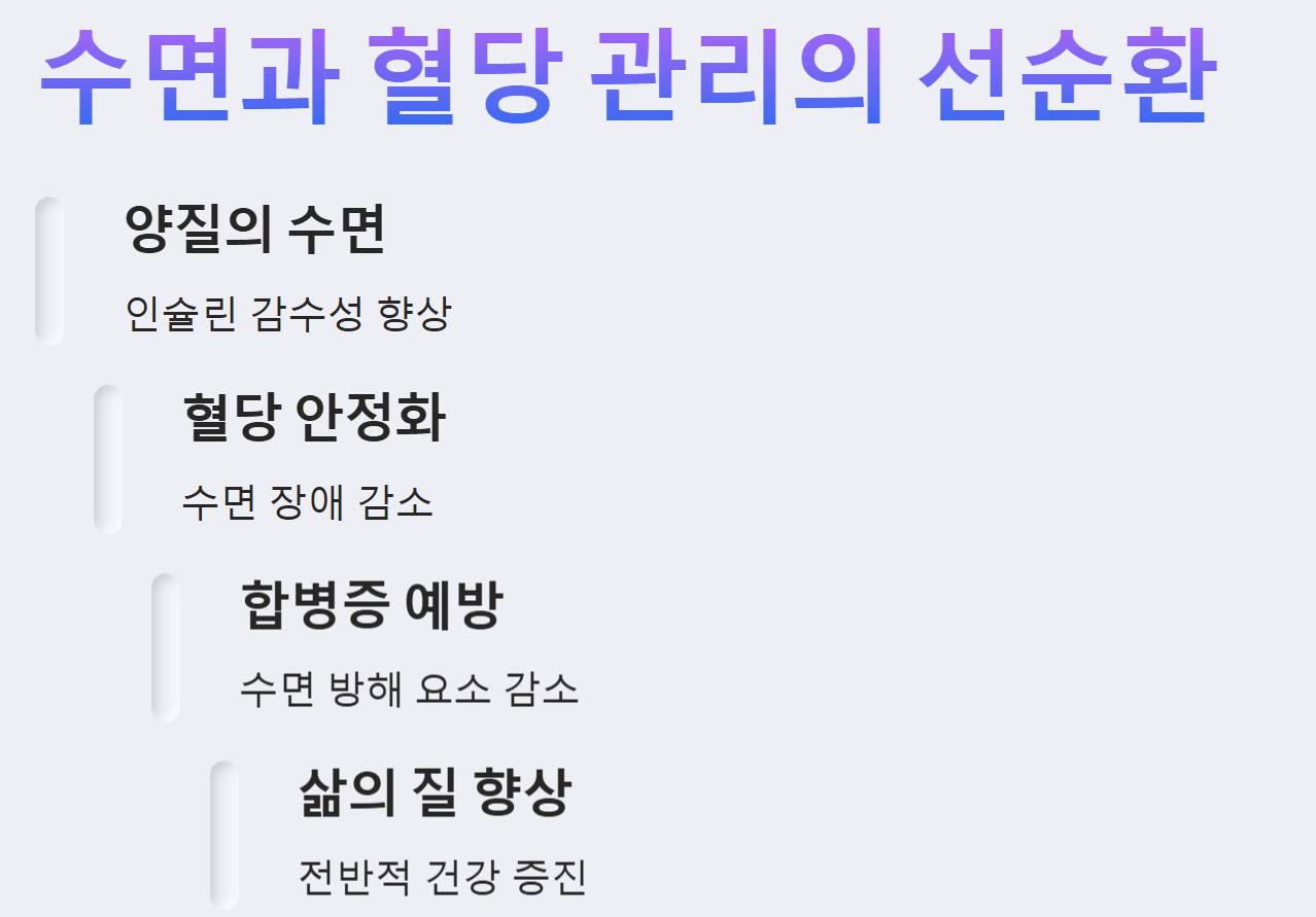 - 스트레스 호르몬: 불안정한 혈당은 스트레스 호르몬인 코르티솔 분비를 증가시키고, 이는 수면의 질을 떨어뜨려 혈당 관리를 더욱 어렵게 합니다.