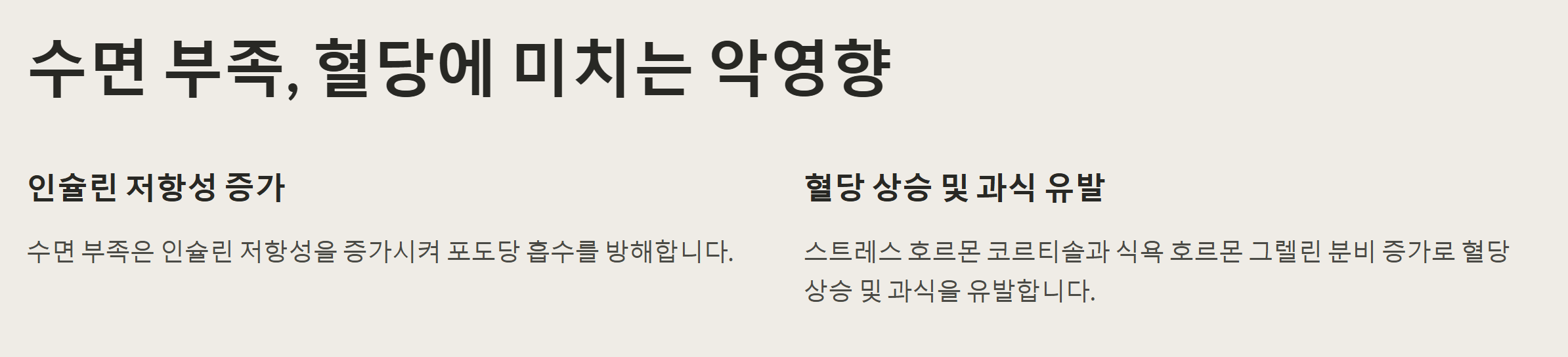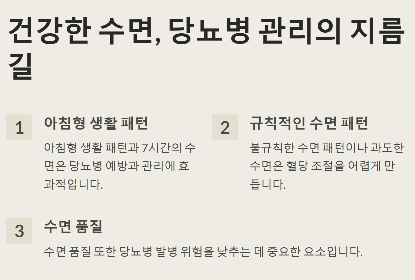 - 수면 품질 향상: 자주 깨거나 깊게 자지 못하는 등 수면의 질이 떨어지면 당뇨병 발병 위험이 크게 증가합니다.