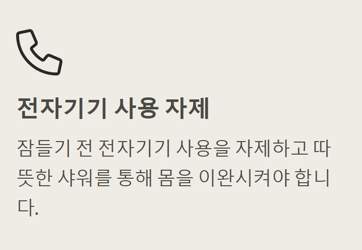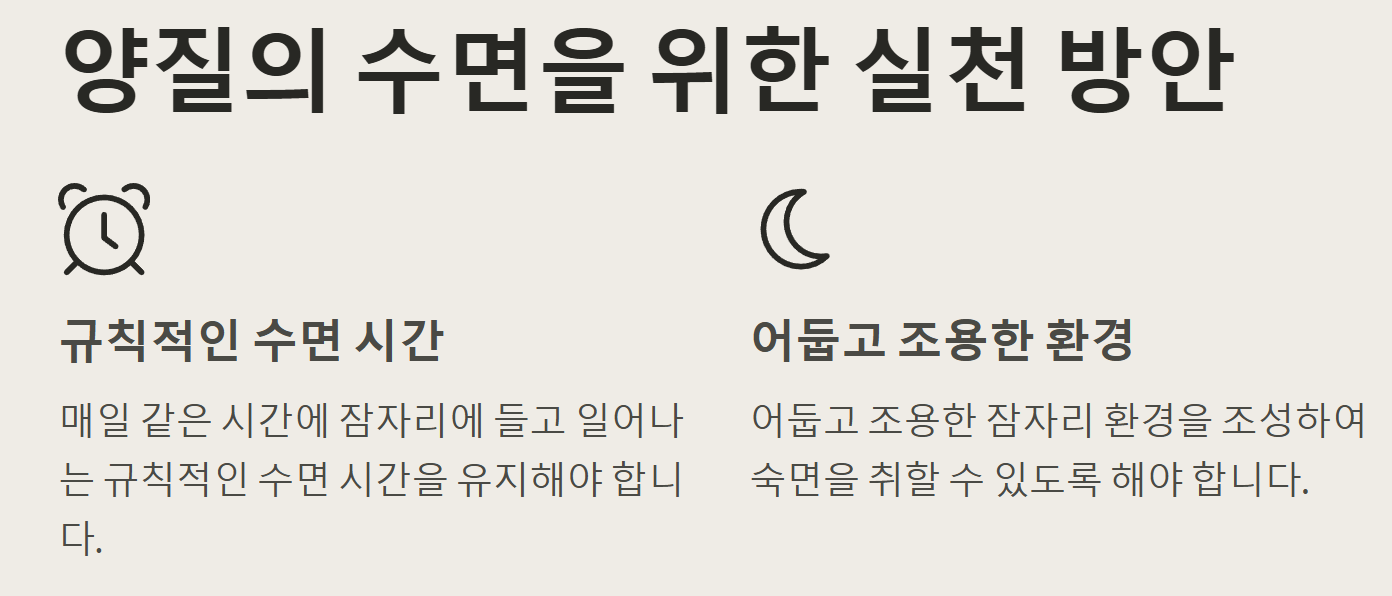 - 수면 환경 개선: 어둡고 조용한 공간에서 편안하게 잠들 수 있도록 환경을 조성하세요.
