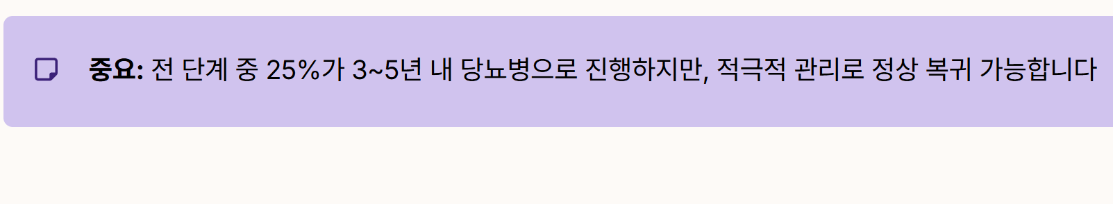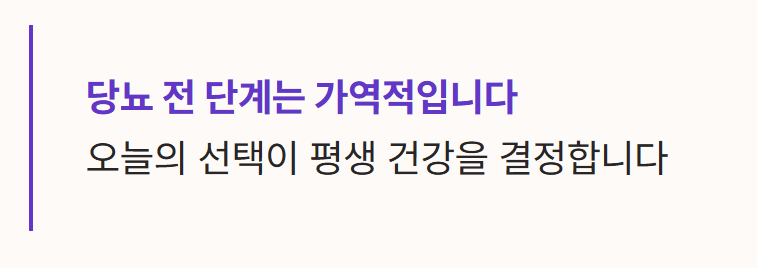 - 진행 위험성: 이 단계는 가역적인 상태이므로 적극적인 관리를 통해 다시 정상 수치로 되돌릴 수 있는 기회입니다.