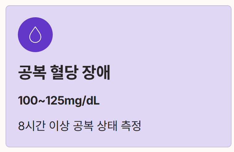 - 공복 혈당 장애: 8시간 이상 공복 상태에서 측정한 혈당이 100~125mg/dL 사이인 경우를 말합니다.