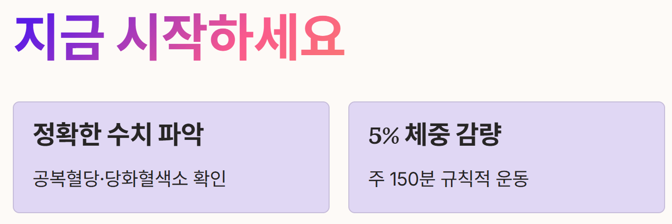 - 규칙적인 신체 활동: 일주일 기준으로 최소 150분 이상의 유산소 운동을 실천하여 근육의 당 흡수력을 높여야 합니다.