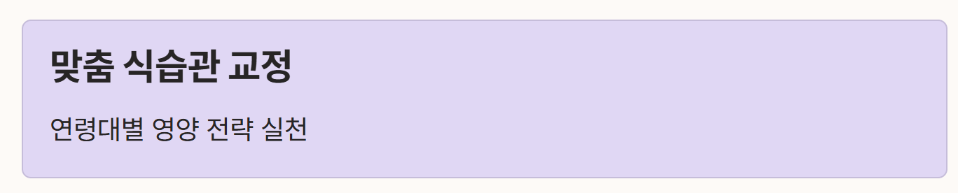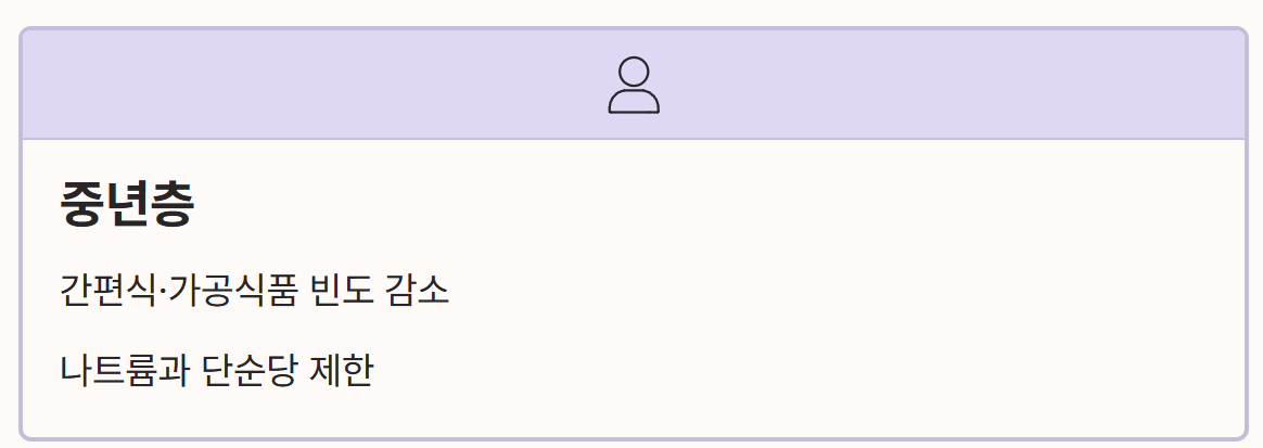- 중년층: 바쁜 일상 속에서 자주 찾게 되는 간편식과 가공식품의 섭취 빈도를 줄여 나트륨과 단순당 섭취를 제한합니다.