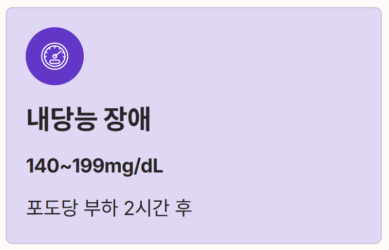 - 내당능 장애: 경구 포도당 부하 검사 시행 2시간 후 혈당 수치가 140~199mg/dL로 나타나는 상태입니다.