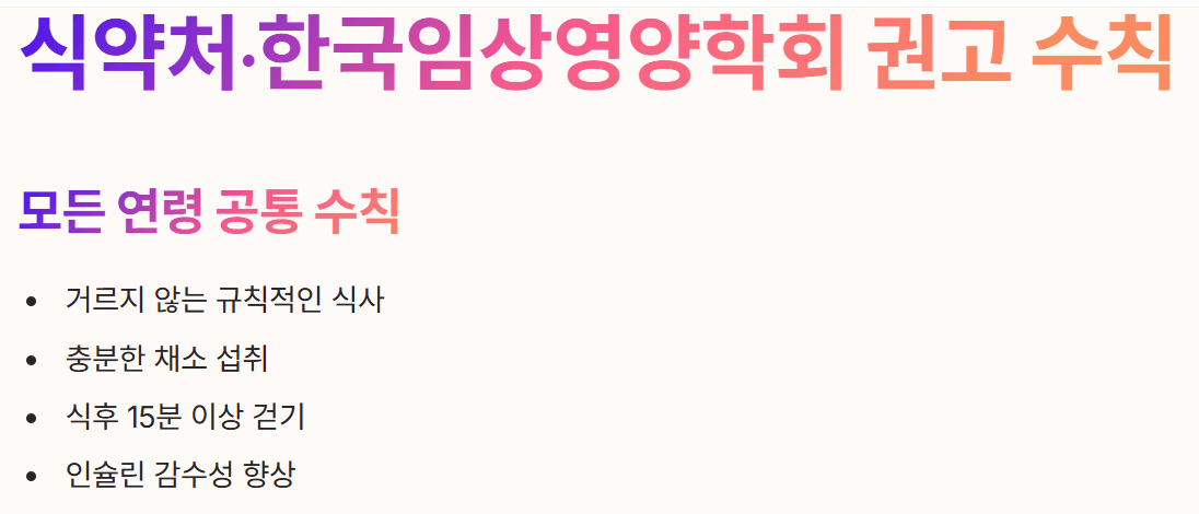 - 공통 수칙: 거르지 않는 규칙적인 식사와 식후 15분 이상의 걷기는 인슐린 감수성을 높이는 가장 기본적인 습관입니다.