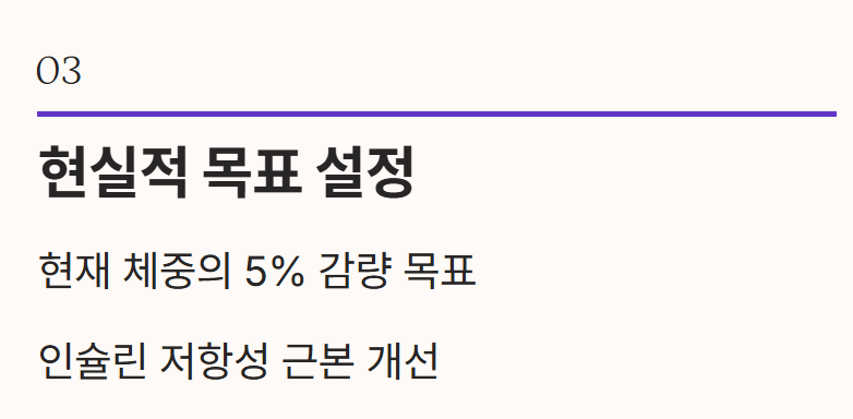 - 감량 목표 설정: 무리한 감량보다는 자신의 현재 체중에서 5% 내외를 목표로 설정하여 요요 현상 없이 장기적으로 유지하는 것이 핵심입니다.