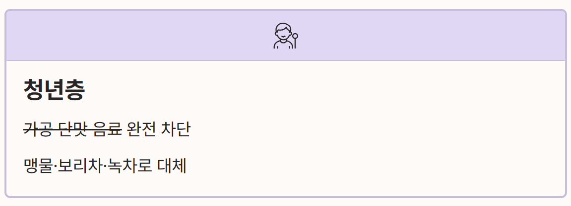 - 청년층: 가공된 단맛 음료를 완전히 차단하고 맹물이나 보리차, 녹차 등 무가당 음료로 대체해야 합니다.