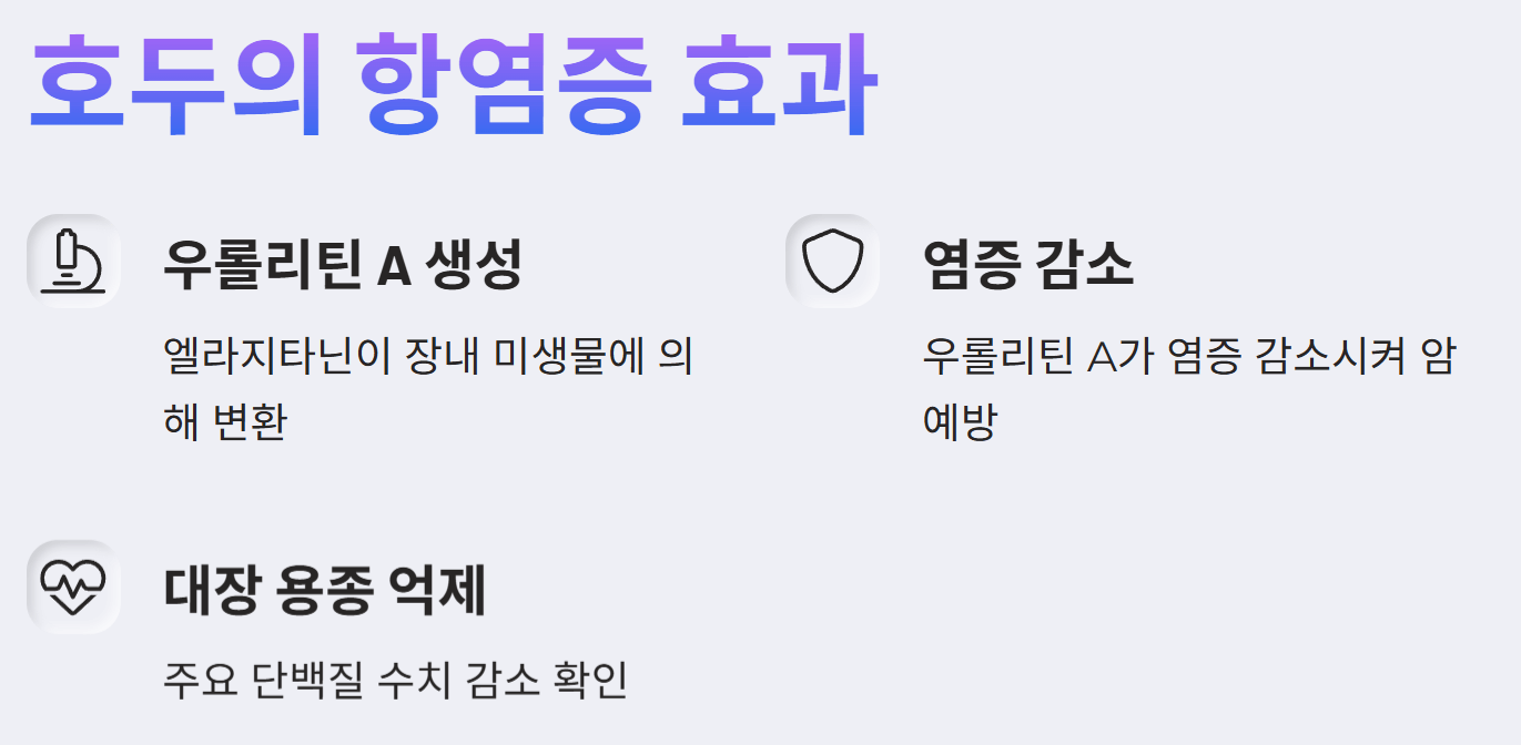 - 우롤리틴 A 생성: 호두에 포함된 엘라지타닌은 장내 미생물에 의해 우롤리틴 A라는 항염증 물질로 변환됩니다. 이 물질은 염증을 줄여주고, 대장암 예방에 중요한 역할을 합니다.