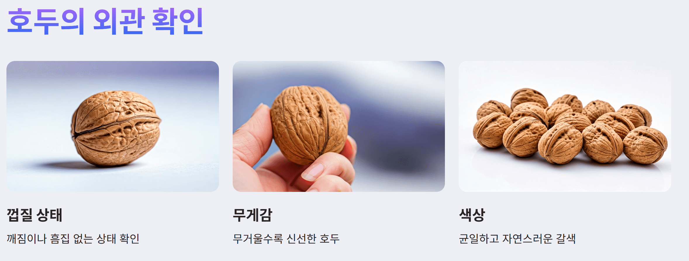 - 색상 확인: 호두의 색이 균일하고 자연스러운 갈색을 띠는지 확인하세요. 변색이 있거나 불균일한 색상은 품질이 떨어질 수 있습니다.