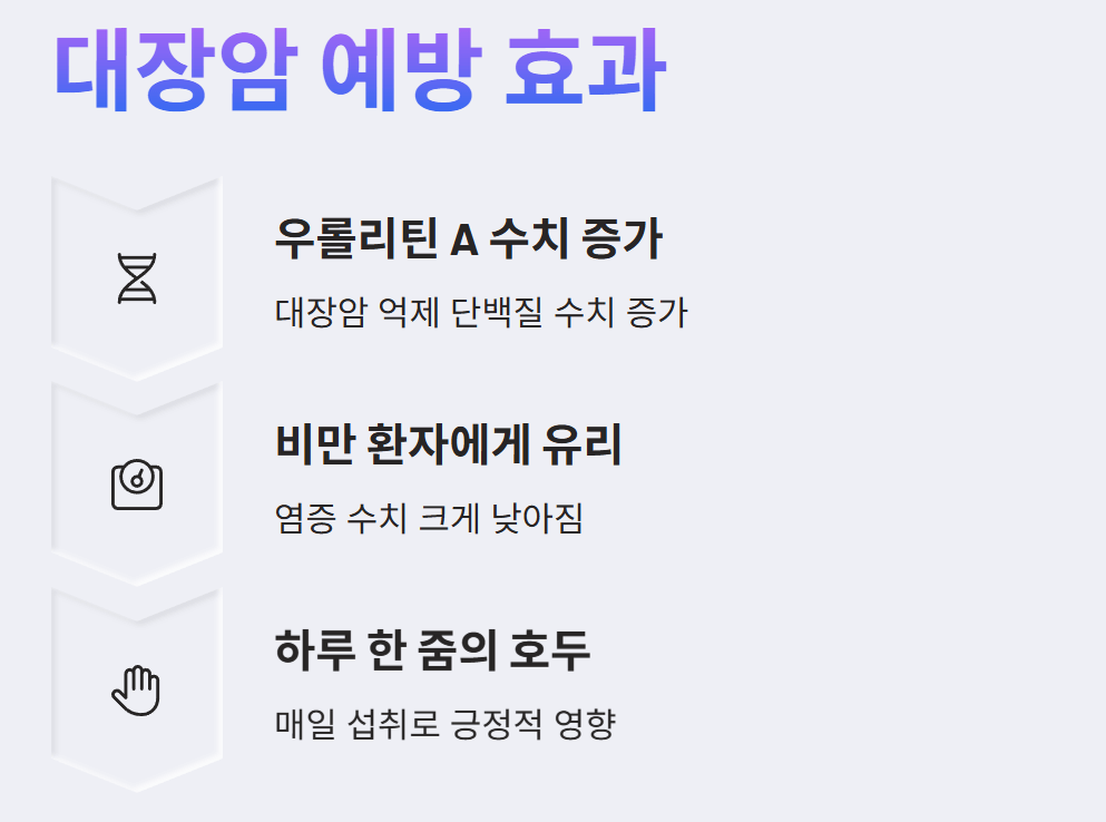 - 염증 감소: 우롤리틴 A는 염증을 감소시키는 작용을 하여, 염증이 주요 원인인 암 예방에 중요한 효과를 가져옵니다.
