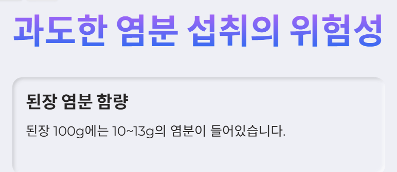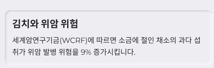 - 과도한 염분 섭취의 위험성: 된장과 김치에는 항암 성분을 비롯한 다양한 유익한 성분이 많지만, 동시에 높은 염분을 포함하고 있습니다. 국립농업과학원 자료에 따르면 된장 100g에는 10~13g의 염분이 들어있으며, 세계암연구기금(WCRF)에서는 김치와 같은 소금에 절인 채소의 과다 섭취가 위암 발병 위험을 9% 증가시킨다고 보고하고 있습니다. 건강을 위한다면 염분 섭취량에 대한 주의가 필요합니다.