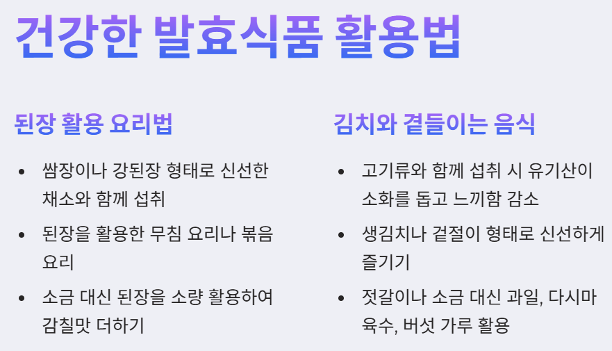 된장과 김치를 건강하게 섭취하는 방법은 단순히 양을 조절하는 것을 넘어, 요리법과 함께 먹는 음식의 조합에도 신경 쓰는 것을 의미합니다. 우리 식탁의 중심에 있는 이 발효식품들을 더욱 이롭게 즐기기 위한 구체적인 방법들을 소개합니다.