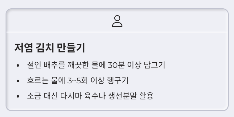- 저염 김치 담그기 및 활용: 가정에서 저염 김치를 담그는 습관을 들이는 것은 매우 중요합니다. 배추를 절일 때 소금량을 줄이거나, 절인 배추를 깨끗한 물에 충분히 헹궈 소금기를 빼는 것이 필수적입니다. 김치 양념에 젓갈이나 소금 대신 과일, 다시마 육수, 버섯 가루 등을 활용하여 자연스러운 감칠맛을 내는 것도 좋은 방법입니다. 이렇게 담근 저염 김치는 하루 권장 섭취량을 조금 더 여유롭게 즐길 수 있게 해주며, 건강한 식습관을 유지하는 데 큰 도움이 됩니다.