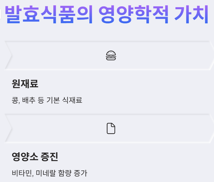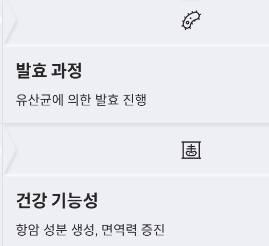 - 항암 성분 생성과 영양소 증진: 발효 과정은 단순히 맛을 좋게 하는 것을 넘어, 원재료에는 없거나 미미했던 항암 성분과 같은 기능성 물질을 새롭게 생성하거나 그 함량을 증가시킵니다. 예를 들어, 콩이 발효되면서 만들어지는 된장의 경우 콩 단백질의 소화 흡수율이 30%가량 높아지는 것으로 알려져 있습니다. 김치 또한 발효를 통해 비타민C, 비타민B군 등의 함량이 증진되며, 유산균 대사산물은 장 건강에 유익한 영향을 미칩니다.