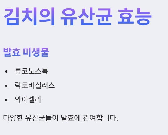 - 김치의 발효 미생물: 김치는 배추 등의 채소를 절이고 양념과 혼합하여 발효시키는 과정을 거칩니다. 류코노스톡, 락토바실러스, 와이셀라 등 다양한 유산균들이 발효에 관여하며, 이 과정에서 젖산, 아세트산, 프로피온산 등 유기산이 풍부하게 생성됩니다. 더불어 비타민, 무기질, 식이섬유까지 고루 갖추고 있어 김치는 단순한 반찬이 아닌 종합 영양 공급원으로서의 가치를 지닙니다. 이처럼 다양한 유산균은 장내 환경을 개선하고 면역력 증진에도 기여할 수 있습니다.