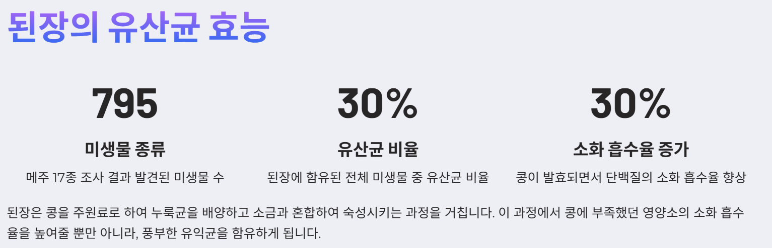 - 된장의 미생물 다양성: 된장은 콩을 주원료로 하여 누룩균을 배양하고 소금과 혼합하여 숙성시키는 과정을 거칩니다. 이 과정에서 콩에 부족했던 영양소의 소화 흡수율을 높여줄 뿐만 아니라, 메주 17종 조사 결과에서 무려 795종의 미생물이 발견되었고, 그중 유산균이 약 30%를 차지할 정도로 매우 풍부한 유익균을 함유하고 있습니다. 이러한 미생물의 다양성은 된장이 단순한 양념을 넘어 살아있는 식품으로서 우리 장 건강에 긍정적인 영향을 미칠 수 있음을 시사합니다.