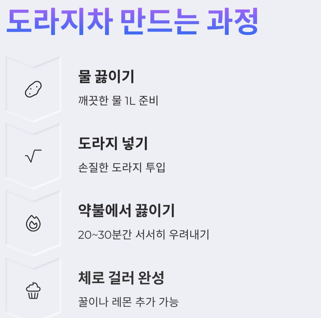 - 끓이기: 물을 끓인 후, 도라지 뿌리를 넣고 약한 불에서 20~30분 동안 끓입니다. 차가 우러나면서 도라지의 유효 성분이 물에 녹아들게 됩니다.