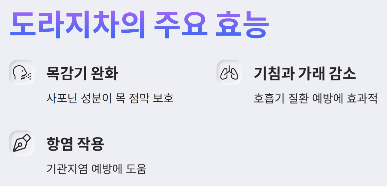 도라지차는 목감기 완화, 항염, 해열, 피부 건강에 도움을 줄 수 있는 강력한 효능을 자랑합니다. 도라지에는 사포닌, 플라티코딘 등의 성분이 풍부하게 들어 있어 기침과 가래를 완화하고, 염증을 감소시킬 수 있습니다. 도라지차의 항염 작용은 기관지 건강을 지키고, 자주 발생하는 목 감기나 기관지염 예방에도 효과적입니다.