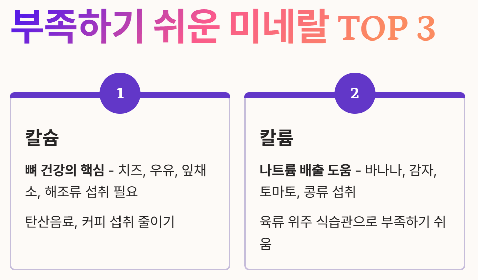 - 칼슘: 뼈 건강의 핵심이지만, 유제품이나 채소 섭취가 적어 부족하기 쉽습니다. 치즈, 우유, 잎채소, 해조류 등을 꾸준히 섭취하고, 칼슘 흡수를 방해하는 탄산음료나 커피 섭취를 줄이는 것이 좋습니다.