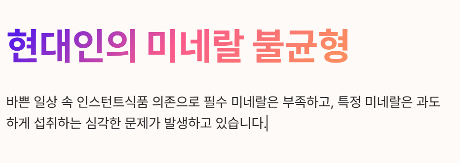 - 토양 환경의 변화: 농업 토양의 미네랄 함량이 줄어들면서 같은 채소나 과일을 섭취해도 과거보다 미네랄 섭취량이 감소하는 문제가 발생하고 있습니다.