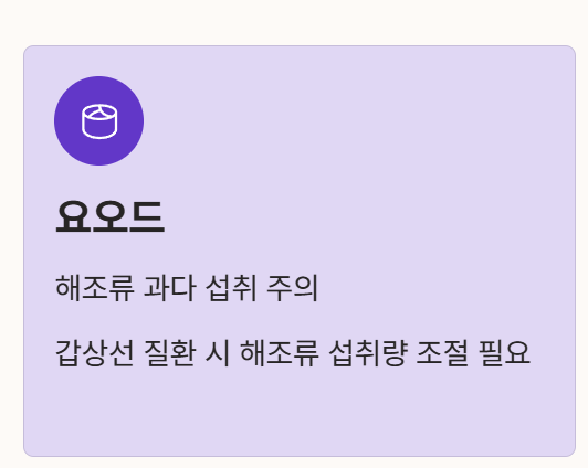 - 요오드: 해조류를 즐겨 먹는 식습관으로 인해 과잉 섭취할 위험이 있습니다. 갑상선 질환이 있다면 해조류 섭취량을 조절하는 것이 필요합니다.