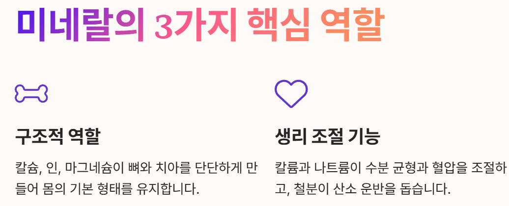 - 구조적 역할: 칼슘, 인, 마그네슘 등은 뼈와 치아를 단단하게 만들어 우리 몸의 기본적인 형태를 유지하는 데 기여합니다.