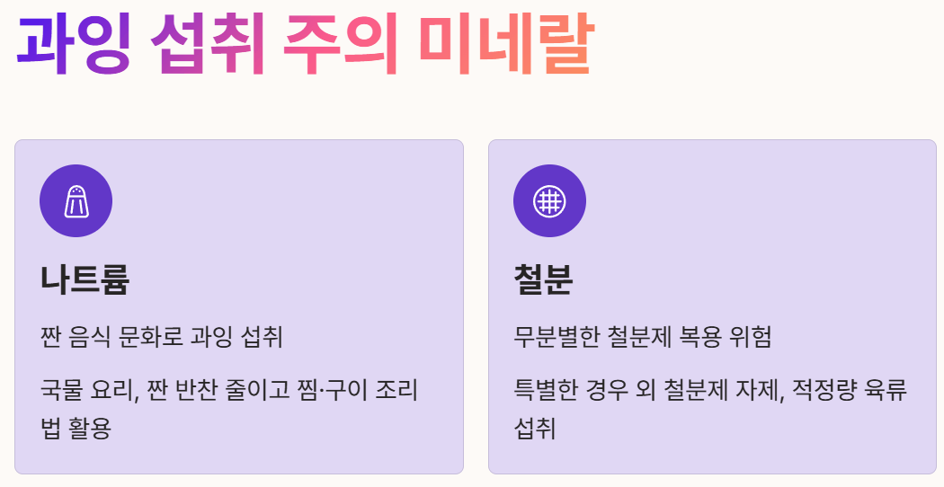 - 나트륨: 짠 음식을 즐겨 먹는 식문화 때문에 과잉 섭취하는 경우가 많습니다. 국물 요리나 짠 반찬 섭취를 줄이고, 조리법을 찜이나 구이로 바꾸는 것이 도움이 됩니다.