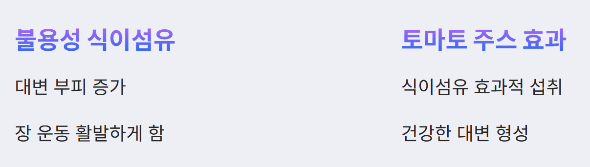 - 수용성 식이섬유: 토마토에는 수용성 식이섬유가 풍부하게 함유되어 있습니다. 이 섬유질은 소화 과정에서 물을 흡수하여 젤 형태로 변하면서 음식물의 이동을 부드럽게 하고 소화를 촉진하는 역할을 합니다. 특히 토마토를 착즙 주스로 섭취할 경우, 수용성 식이섬유를 더욱 효과적으로 섭취할 수 있습니다.