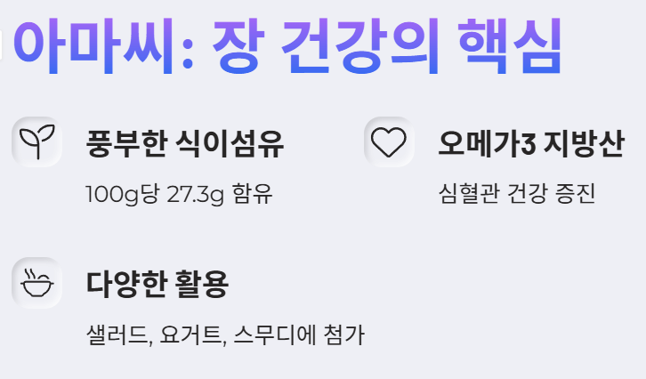 작지만 강력한 효능을 지닌 아마씨는 식이섬유가 풍부한 대표적 식품으로 손꼽힙니다. 아마씨 100g에는 무려 27.3g의 식이섬유가 함유되어 있어, 쾌변을 돕고 장 건강을 증진시키는 데 탁월한 효과를 발휘합니다. 실제로 많은 분들이 변비 증상 완화와 체중 감량을 위해 아마씨를 꾸준히 섭취하고 있으며, 그 효과를 경험하고 있습니다.