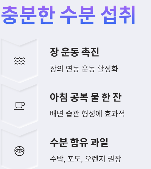 - 아침 공복 물 한 잔: 배변 습관 형성에 효과적입니다.