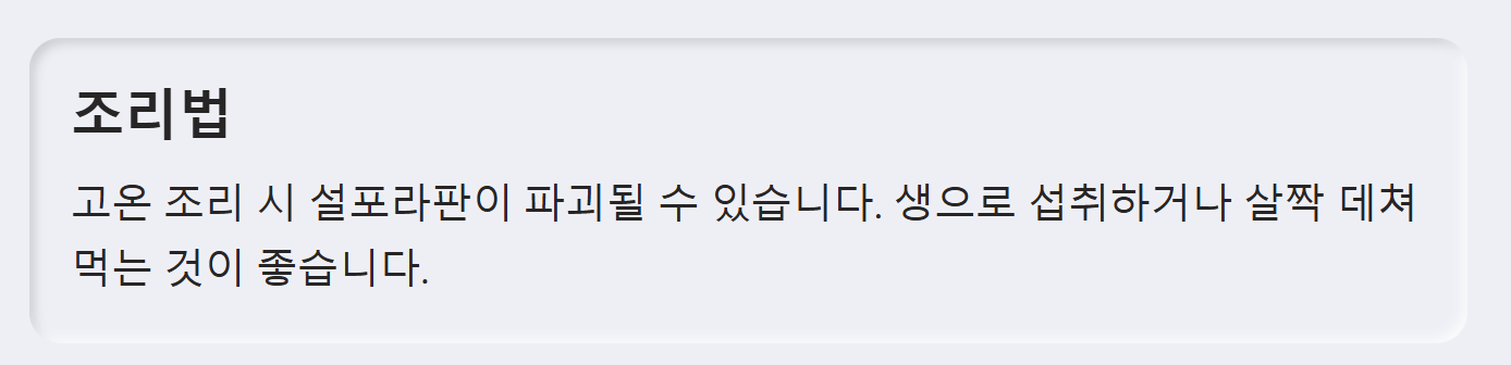 - 고온에서 조리하면 파괴되기 때문에 가급적 생것으로 섭취, 데치거나 찌는 방식 사용
