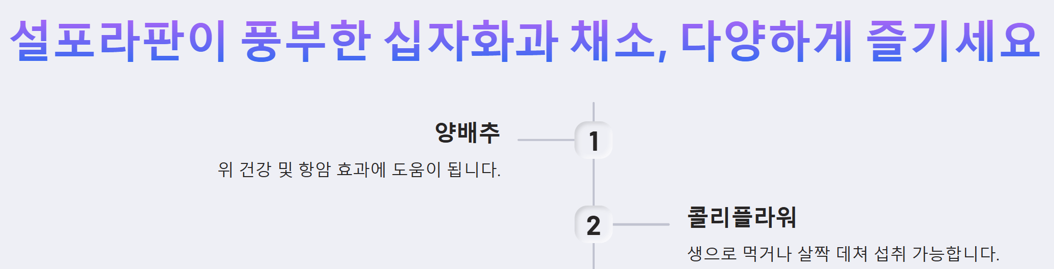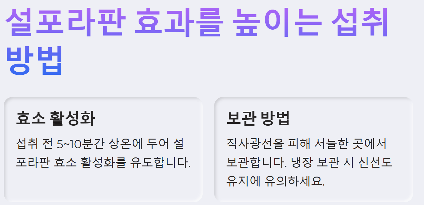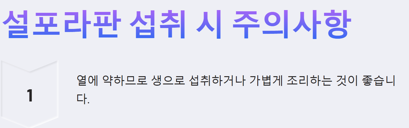 - 십자화과 채소에 함유된 설포라판은 열에 약하므로, 가급적 생으로 먹거나 살짝 데쳐 먹는 것이 좋습니다.